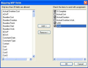 This function allows you to add the MSP (Microsoft Project) Custom Fields into EasyTaskLink. This information will be available for Project Center and Dashboard display. When the Mapping MSP fields screen appears during publishing you are allowed to select up to 20 Microsoft Project fields to map in EasyTaskLink as Custom User Extension Fields. MPP fields appear on the left side of the screen and may be mapped by clicking the Add button. These fields can also be displayed on the team members’ task in Outlook by checking the box next to the field. Click OK to complete mapping. To modify the selection of these fields from the EasyTaskLink drop down in Microsoft Project select Administrator...MSP Custom Fields Mapping.