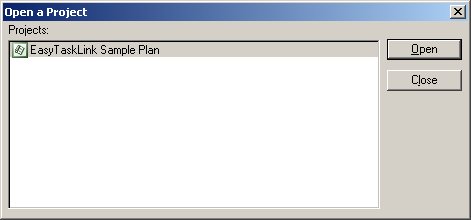 You open an existing project plan within Microsoft Project from the EasyTaskLink button select Open. This operation opens a dialog box which lists all projects in the EasyTaskLink Task database that the user has privilege to access. Select a project from the list.
