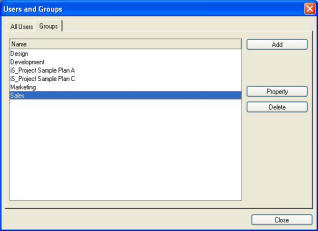 From the Project Center click the Utility button and select Users and Groups from the menu.  From the Groups tab, highlight a group and click the Property button, then select the User tab.